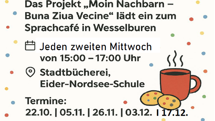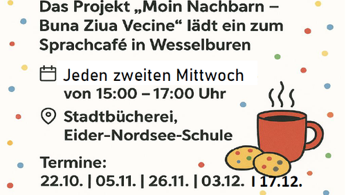 Haben Sie Lust darauf, in der Wesselburener Stadtbücherei in netter Gesellschaft deutsch zu sprechen und Kaffee zu trinken? Dann sind Sie jeden zweiten Mittwoch im neunen Sprachcafé Wesselburen herzlich willkommen. Für Kinder gibt es eine Spielecke, auf einen Kaffee laden wir sie ein.